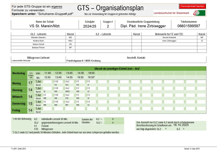 Die Nachmittagsbetreuung wird an 5 Tagen (Montag bis Freitag) von 11:40 Uhr bis 16:30 Uhr abgehalten.
